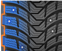 | • ThermoActive turviseühend parandab naastude vastupidavust ja tagab suurepärase haarduvuse jäisel teekattel MICHELINi ThermoActive turviseühendi omadused muutuvad vastavalt temperatuurile. Näiteks muutub soojema ilmaga rehvi MICHELIN X-ICE North 3 sisemine kummiühend pehmemaks ja kui rehv on teega kokkupuutes vajuvad naastud sügavamale turvisesse. Samal ajal paraneb haarduvus kuival ja märjal teekattel ning libisemise oht väheneb ning paraneb mugavus ja väheneb rehvi müratase. |